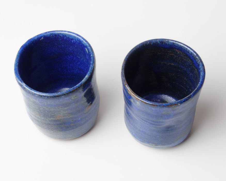 Feito na roda de oleiro com argila vermelha e vidrado cristalino azul.