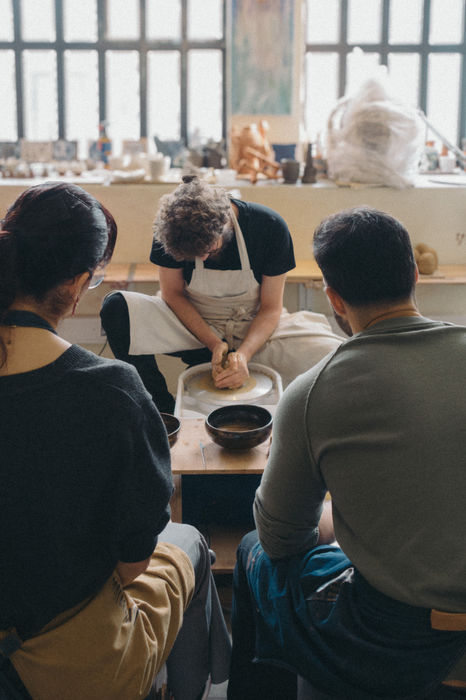 Mostramos como se faz: preparar o barro, centrar, puxar formas. Copos, chávenas, tigelas — o que vier das mãos. Cada pessoa trabalha com a sua própria roda. Experimenta, erra, repete. Escolhe um vidrado, e depois tratamos do resto: cozedura, acabamento. No fim, ficas com duas peças. Levas quando estiverem prontas — duas ou três semanas depois.